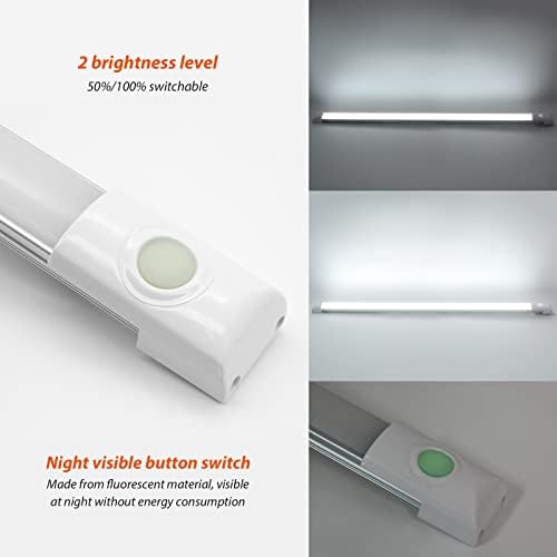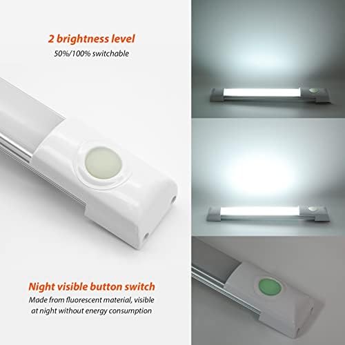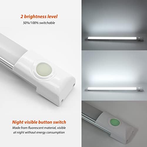 Our light features a built-in button switch with a convenient green indicator that shines brightly at night without consuming power. This smart switch allows you to control two brightness levels: a single click provides 50% white light, while a second click boosts it to 100% white light. Please note that this light is not compatible with external switches and does not retain memory settings.