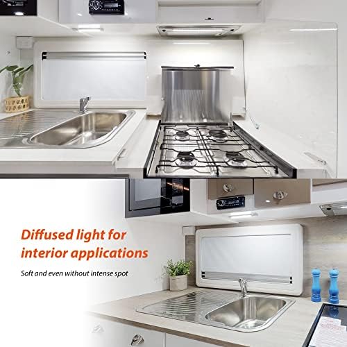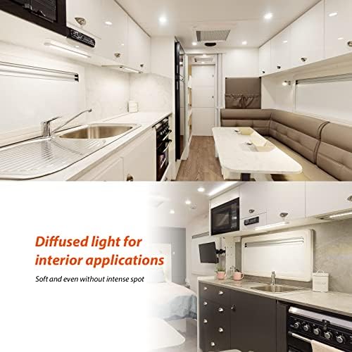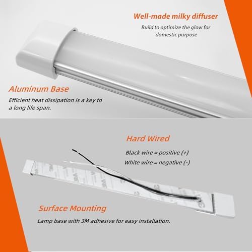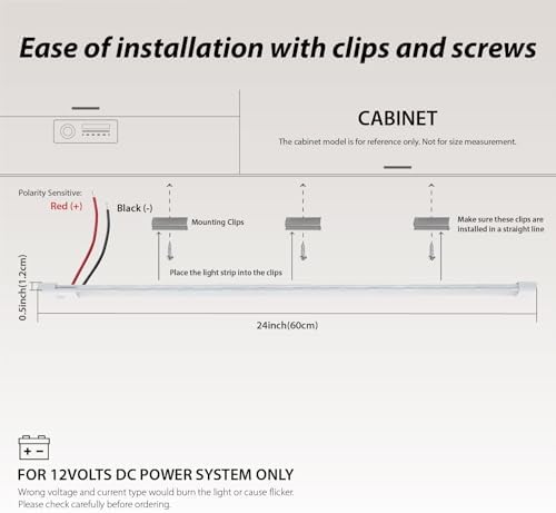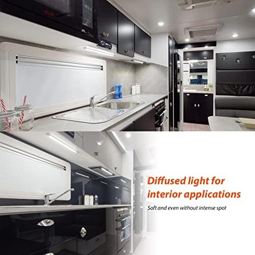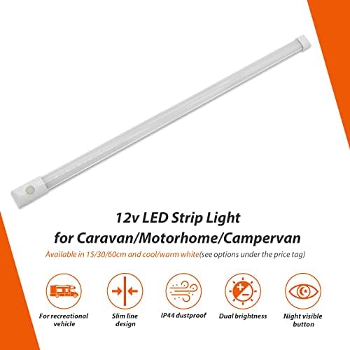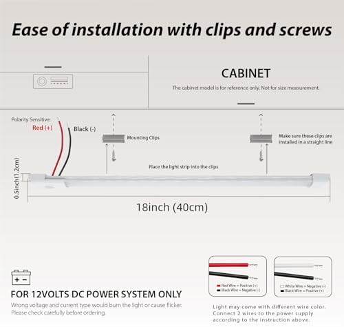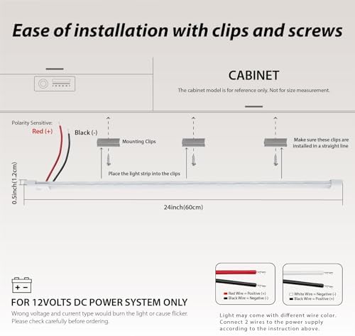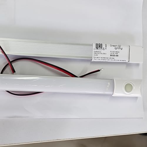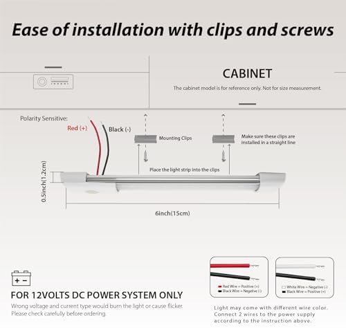 Introducing our 12 Volt Slim Light Strip, measuring just 12″(L) x 0.8″(W) x 0.5″(H). This compact and super slim design is an ideal solution for enhancing interior lighting in your DC 12 volt caravans, RVs, trailers, motorhomes, boats, yachts, cabins, and staterooms. Whether you need under cabinet lighting or over sink illumination, this hard-wired light fixture meets your needs seamlessly. For installation, remember that the black wire is positive (+) and the white wire is negative (-).